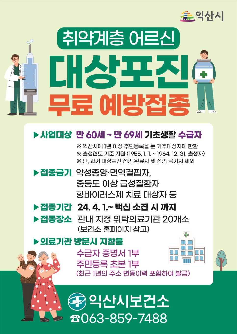 접종을 희망하는 경우 수급자 증명서와 주민등록 초본 또는 등본을 준비해 지역 위탁 의료기관에 방문하면 된다. 위탁 의료기관은 20개소이며 더욱 자세한 내용은 익산시보건소(063-859-7482)로 문의하면 안내를 받을 수 있다.