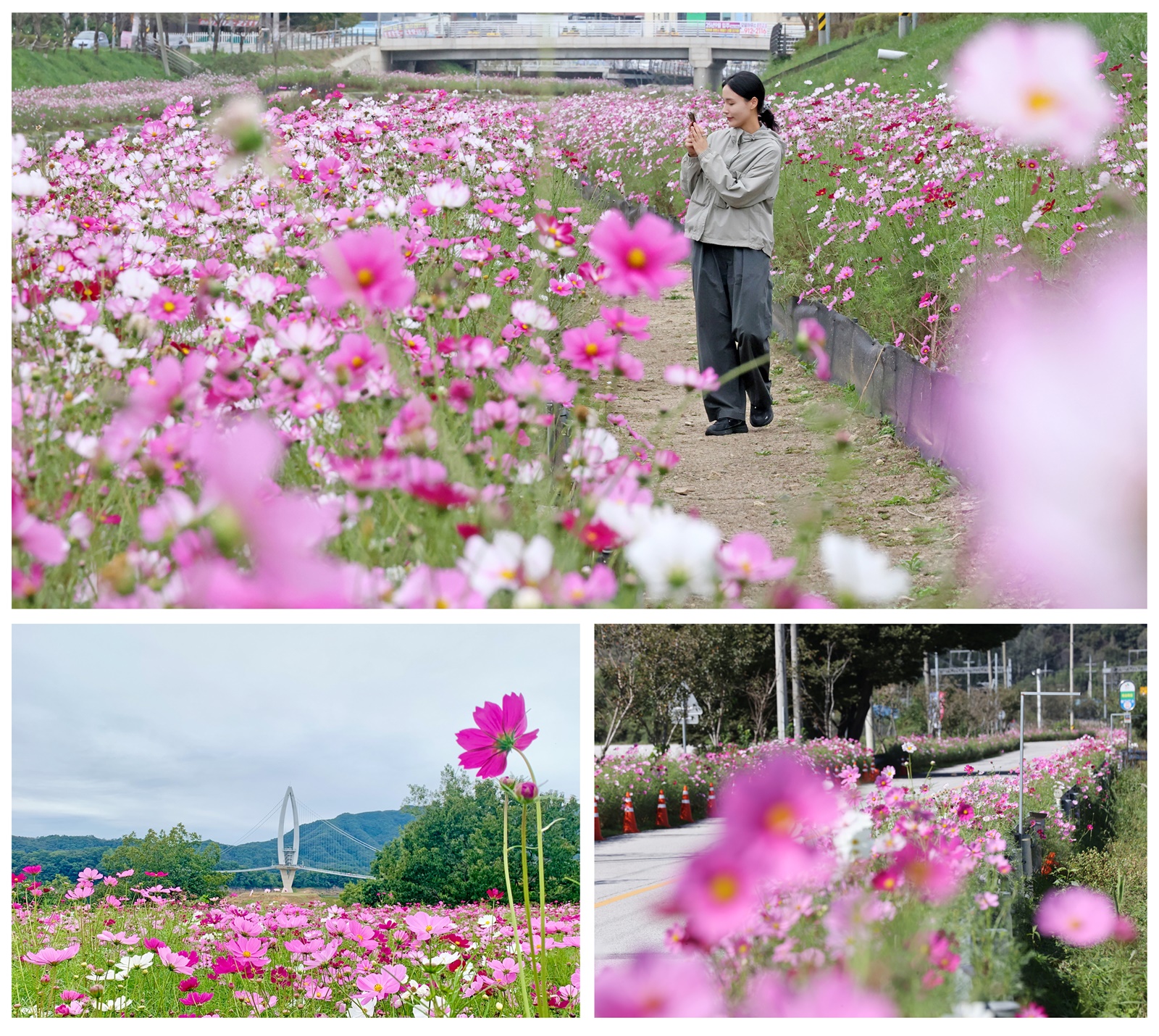 특히, 이 코스모스 꽃밭은 옥정호와 출렁다리를 배경으로 조성되어 울긋불긋 형형색색의 꽃이 옥정호의 윤슬과 어우러지며 청명한 하늘과 함께 장관을 이루고 있다.