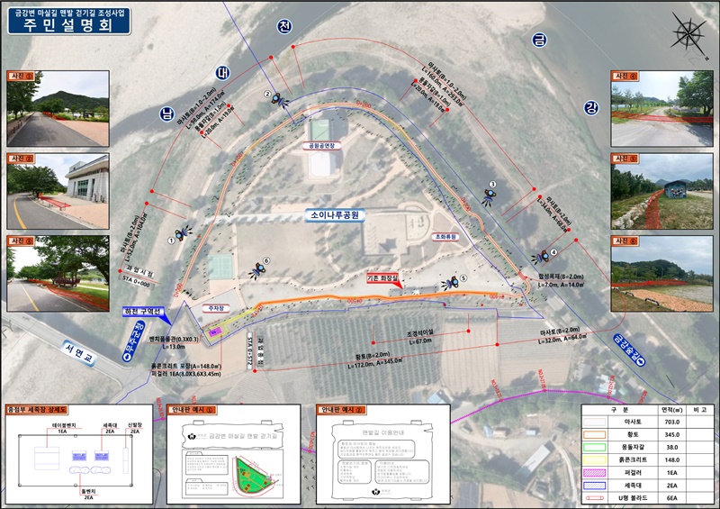 무주군에 따르면 아름다운 금강을 배경으로 황톳길(172m)과 마사토길(400m), 몽돌자갈지압길(40m)이 조성되며 발을 씻는 곳(1곳)과 신발 보관함, 안내판, 벤치 등이 설치될 예정이다.