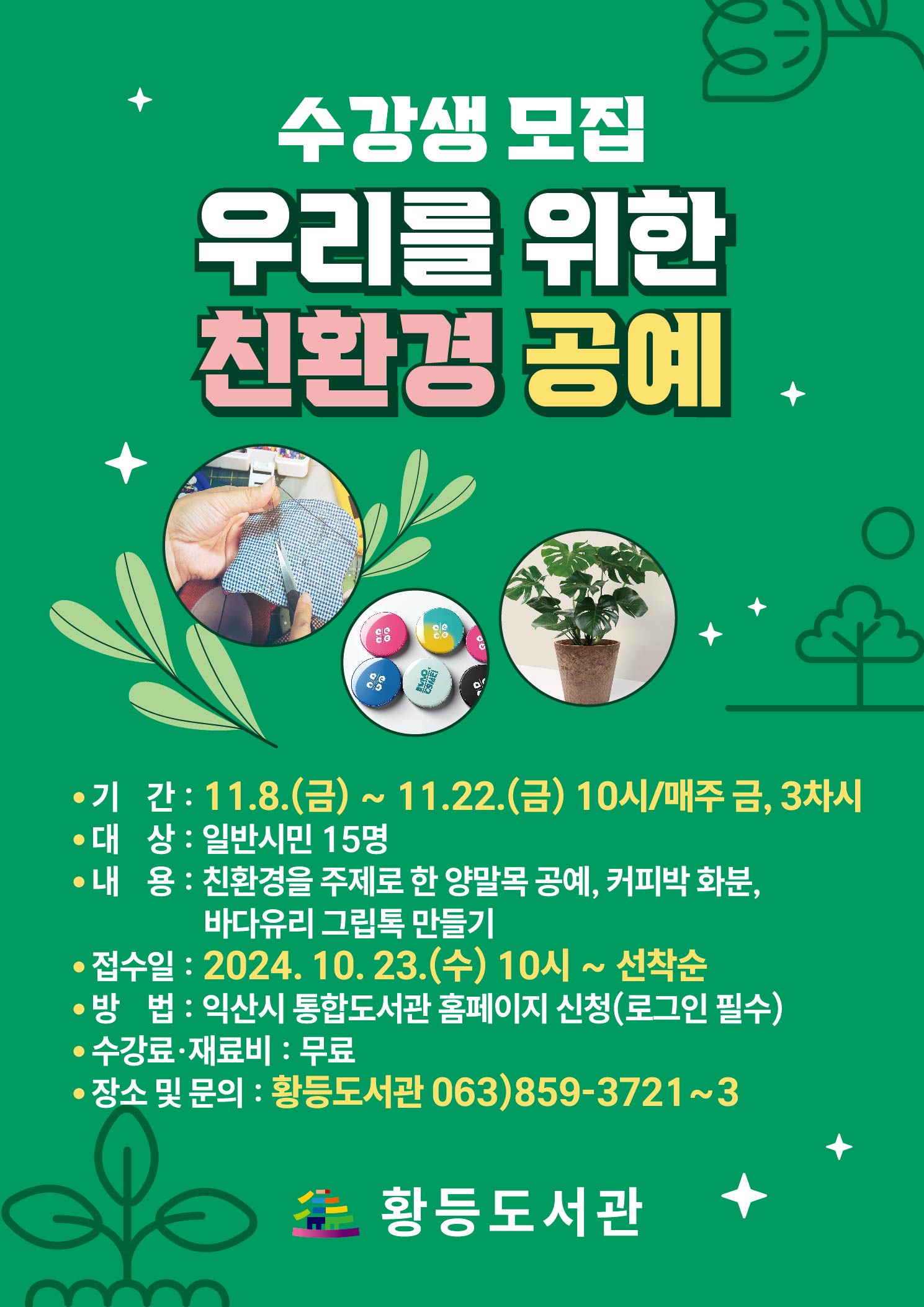 [익산=뉴전북] 익산시 황등도서관이 공예 특성화 프로그램 '우리를 위한 친환경 공예'를 운영한다.