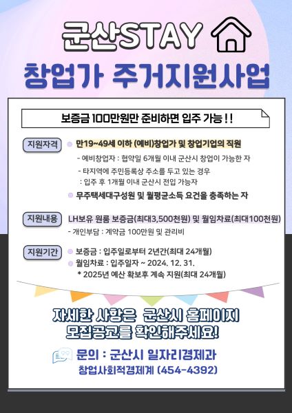 [군산=뉴전북] 군산시는 안정적인 주거환경 제공으로 주거비 부담 완화 및 창업에 전념할 수 있는 환경 조성을 위해 23일 2024년 “군산 STAY 창업가 주거지원사업” 참여자를 상시 모집한다고 밝혔다.
