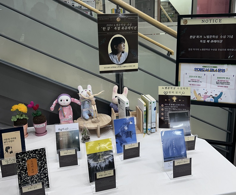 또한 도서관 일반자료실에 한강 작가의 작품과 서평을 전시하는 북 큐레이션과 내 마음을 울리는 작품 속 한 문장 필사 코너, 시립도서관 홈페이지에 한 줄 서평 남기기를 통해 수상 축하 메시지 남기기등을 운영한다.