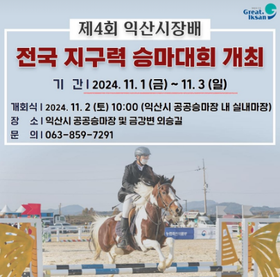 전북자치도 익산시는 1일부터 3일까지 사흘간 금강변을 따라 펼쳐진 특설경기장과 공공승마장에서 전국 승마인이 한자리에 모이는 승마대회가 개최된다고 밝혔다.