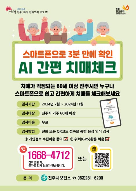 [전주=뉴전북] 과학기술정보통신부와 정보통신산업진흥원(NIPA)이 주관하여 전주시가 2024년 7월부터 해오고 있는 인공지능(AI) 간편치매체크서비스가 오는 11월 말까지 제공된다.