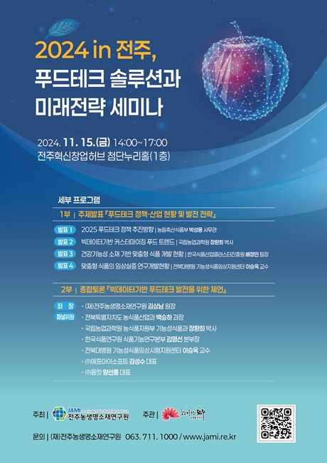 - 시, 오는 15일 전주혁신창업허브에서 ‘2024 in 전주, 푸드테크 솔루션과 미래전략 세미나 개최’
