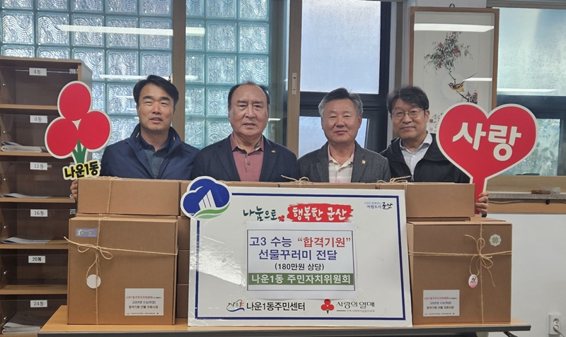 [군산=뉴전북] 군산시 나운1동지역사회보장협의체(공동위원장 이삼석, 이철민)는 지난 12일 관내 저소득가정의 고3 수험생들에게 합격을 기원하는 선물꾸러미를 전달했다.