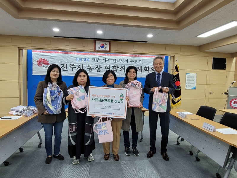 [전주=뉴전북] 사단법인 전주시자원봉사센터(이사장 최이천)는 지난 18일 폐현수막을 활용해 제작한 장바구니 100개를 통장연합회에 전달했다.