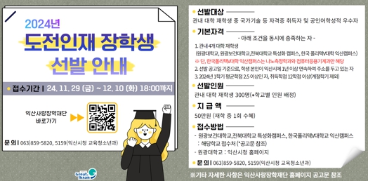 - 익산사랑장학재단, '도전인재 장학생' 선발…익산지역 대학생 대상 - 자격증 취득자·어학 우수자 300명 선정해 장학금 50만 원 지원