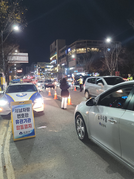 합동 단속은 지난 26일 오후 20시~22시까지 롯데마트사거리에서 실시되었으며, 군산시가 자동차세 체납차량을 대상으로 번호판 영치 및 현장 징수를, 군산경찰서가 교통질서 위반, 음주 운전자 및 과태료 체납자 단속을 진행하였다.