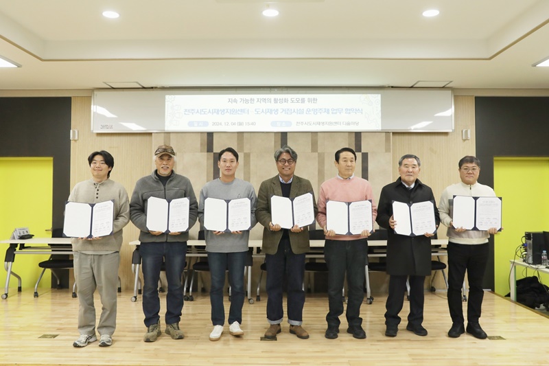 [전주=뉴전북] 전주시도시재생지원센터(센터장 소영식)는 4일 4개 마을관리사회적협동조합과 2개 사회적협동조합 등 전주시 도시재생 거점시설 운영주체 6곳과 상호 협력을 위한 업무협약을 체결했다.