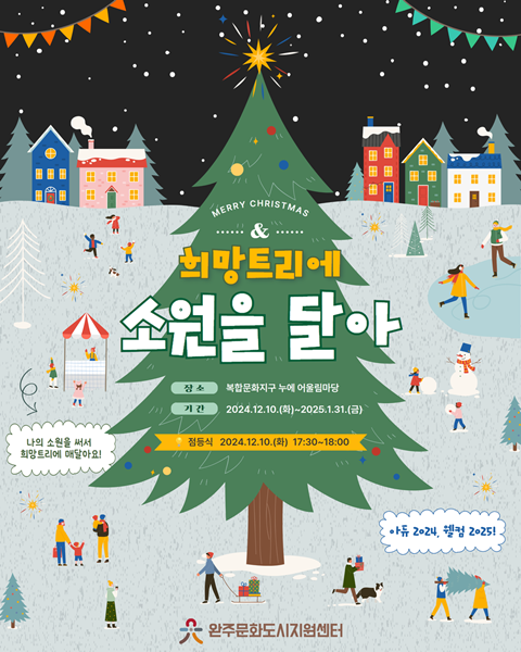 [완주=뉴전북] 완주문화도시지원센터는 아듀 2024, 웰컴 2025를 맞이하며 누구나 고르게 문화를 향유할 수 있는 공공 문화공간을 조성하고자 복합문화지구 누에 어울림마당에 대형 크리스마스 희망 트리를 설치, 운영한다.