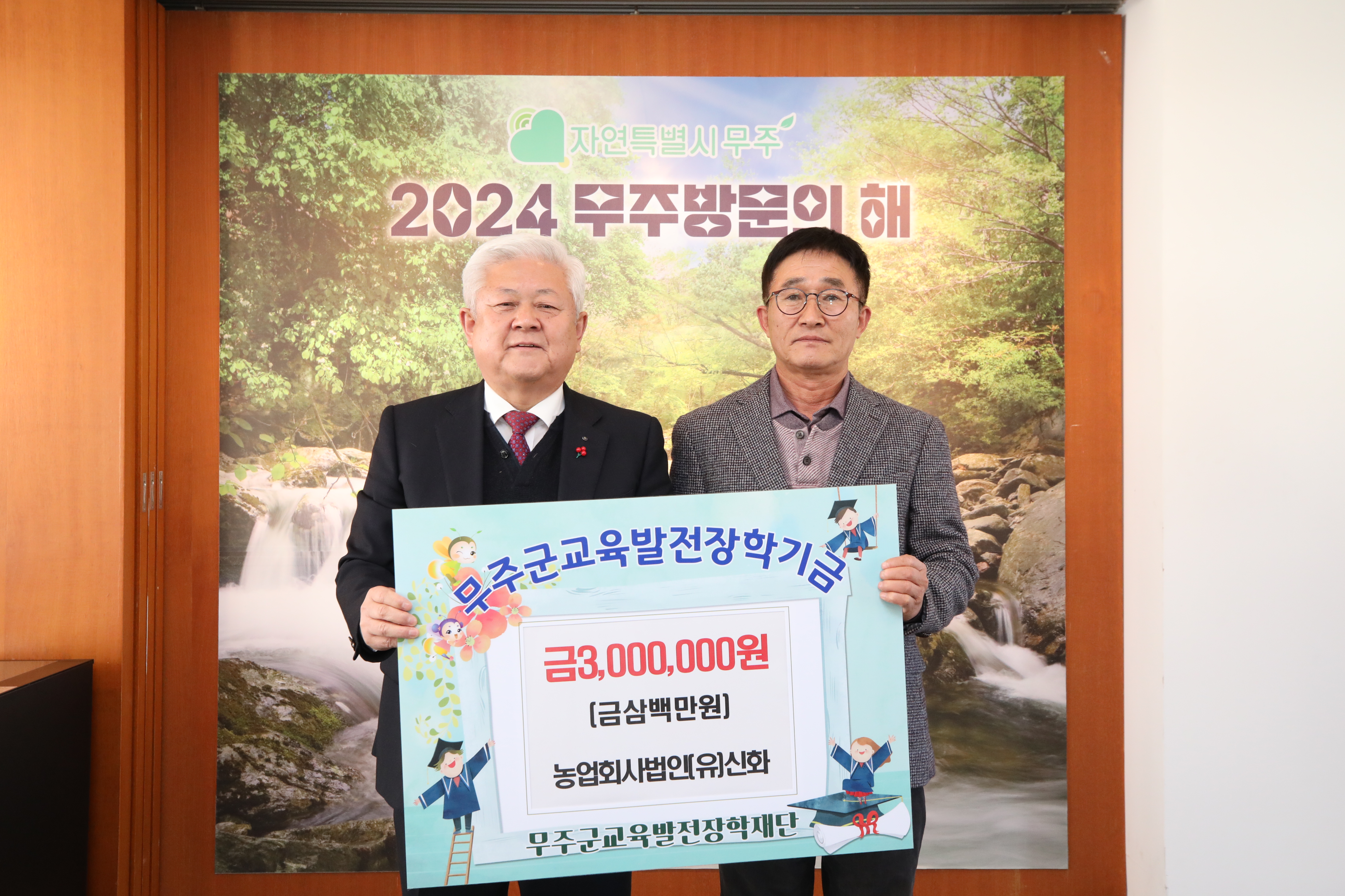 이번 기탁은 무주 지역의 교육 지원과 학생들의 꿈과 희망을 위한 것으로, 유한회사 신화는 지난 2023년에도 무주군교육발전장학재단에 300만 원의 장학금을 기탁한 바 있다.