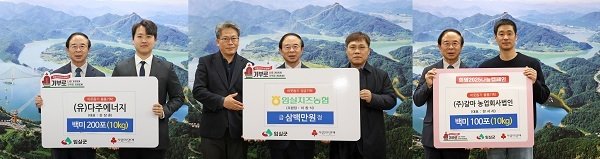 - (유)다주에너지 백미(10KG) 200포, 임실치즈농협 성금 3백만원,㈜갈마 농업회사법인 백미(10KG) 100포 기탁