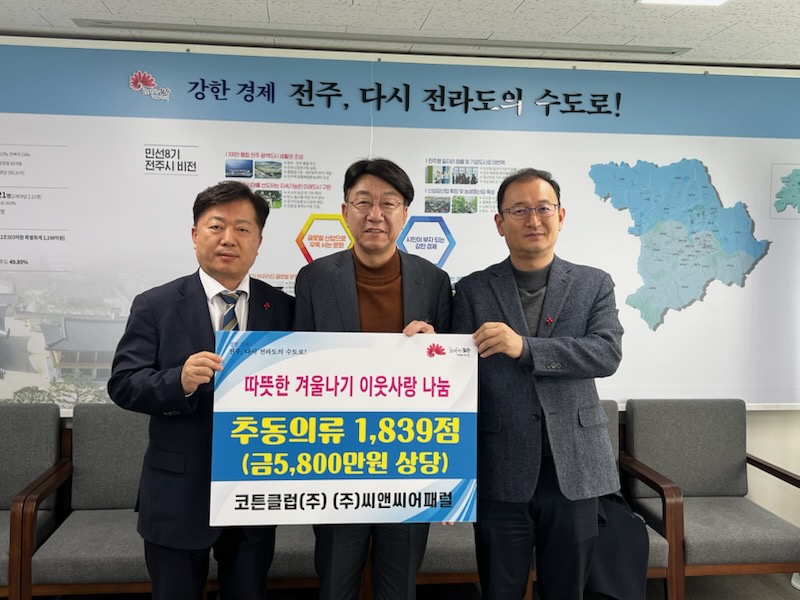한편 전주 코튼클럽㈜, ㈜씨앤씨어패럴은 덕진구 팔복동 소재 언더웨어, 이지웨어 등 생산 제조업체로 매년 동절기 취약계층을 위한 이웃사랑 나눔을 적극적으로 실천하고 있다.