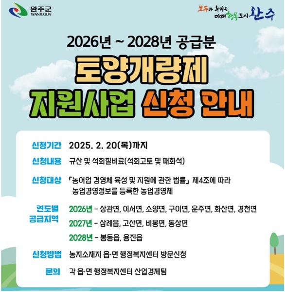 신청한 토양개량제는 선정심사를 거쳐 ▲2026년 상관면, 이서면, 소양면, 구이면, 운주면, 화산면, 경천면 ▲2027년 삼례읍, 고산면, 비봉면, 동상면 ▲2028년 봉동읍, 용진읍에 순차적으로 공급된다. 사업선정자는 공급 시기까지 농업경영체 등록을 유지해야 한다.