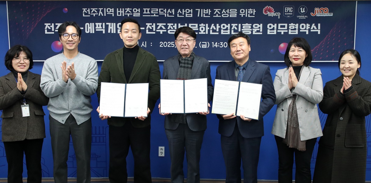 전주시와 에픽게임즈는 10일 시청 3층 회의실에서 우범기 시장과 에픽게임즈 코리아 박성철 대표, 전주정보문화산업진흥원 허전 원장 등이 참석한 가운데 전주지역의 버추얼 프로덕션 산업 기반 조성 및 전문인력 양성을 위한 업무협약(MOU)을 체결했다.