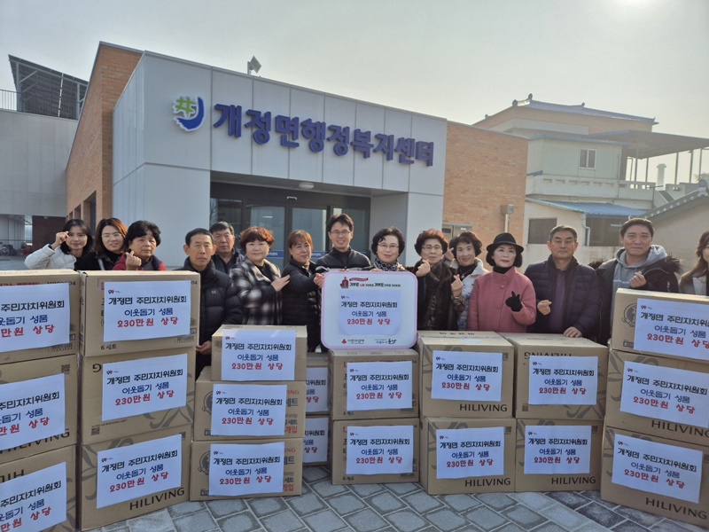 한상봉 개정면장은 “어려운 경제 상황 속에서 성품을 기탁해주신 주민자치위원회에 진심으로 감사드린다”라면서 “추운 겨울 힘겹게 살아가고 있을 어려운 이웃들에게 큰 힘이 되길 바라며 기탁해주신 성품은 관내 도움의 손길이 필요한 이웃들에게 잘 전달하겠다”라고 말했다.