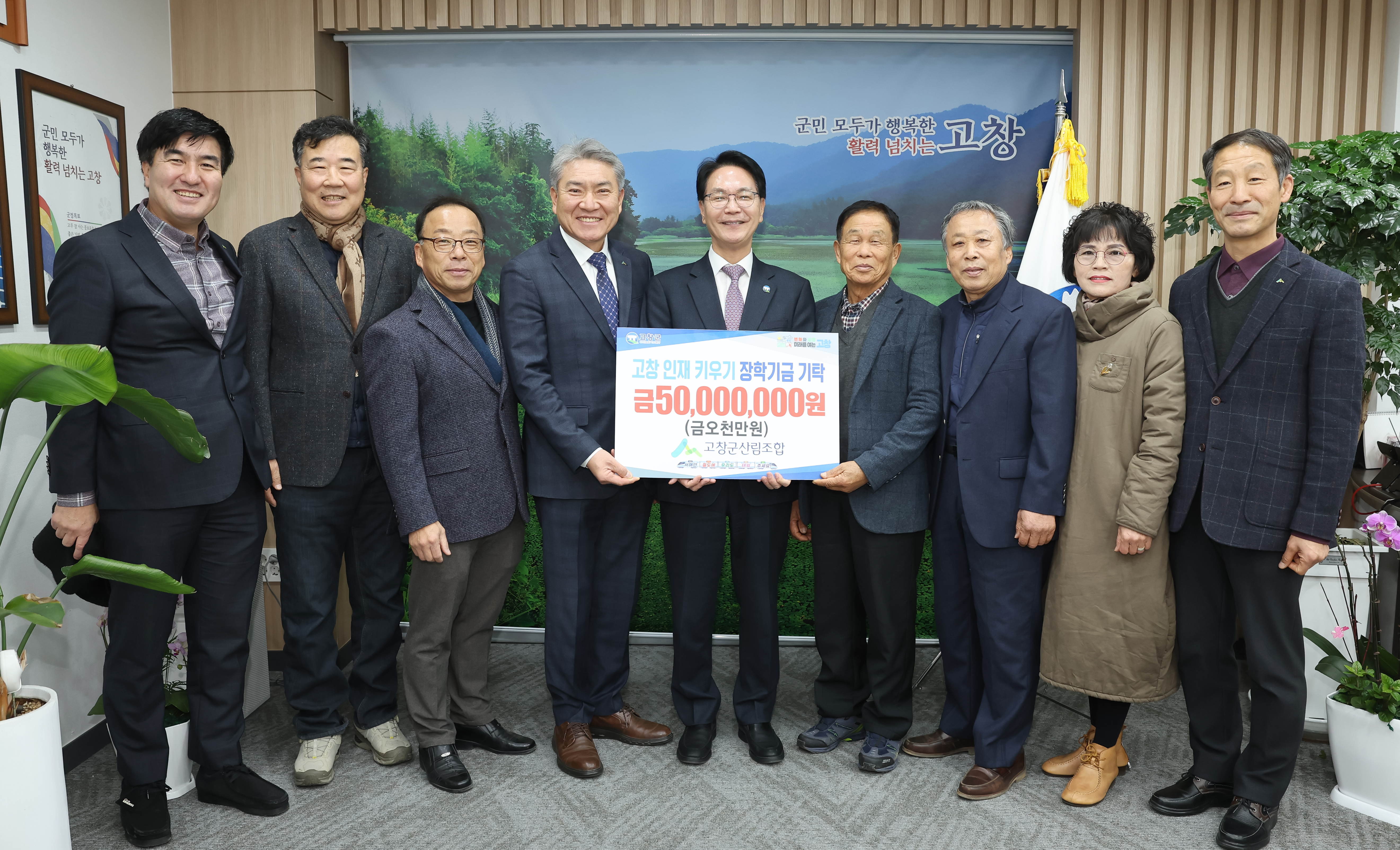 [고창=뉴전북] (재)고창군장학재단(이사장 심덕섭)에 고창군산림조합(조합장 김영건)이 고창인재 키우기 장학금 ‘5000만원’ 기탁하였다.