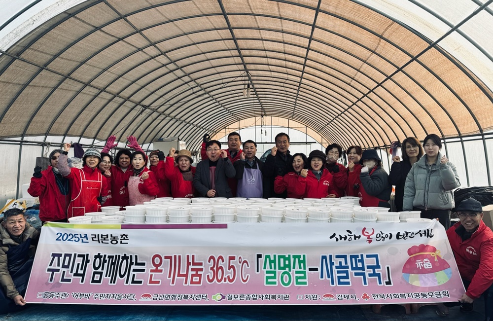 [김제=뉴전북] 김제시 금산면 행정복지센터는 지난 22일, 어부바봉사단(단장 신은학, 부단장 배금례)은 ‘마을공동밥상’은 40명의 회원들이 매월 시기에 맞는 특색있고 영양 높은 도시락을 직접 만들어 홀로 어르신 등 영양취약계층 400세대를 정기적으로 지원하고 있는 사업이다. 이번 영양반찬도시락은 따뜻하고 행복한 설 명절을 보낼 수 있도록 홀로 어르신과 거동불편 어르신에게 떡국 떡과 사골국을 정성스레 끓여 전달했다.