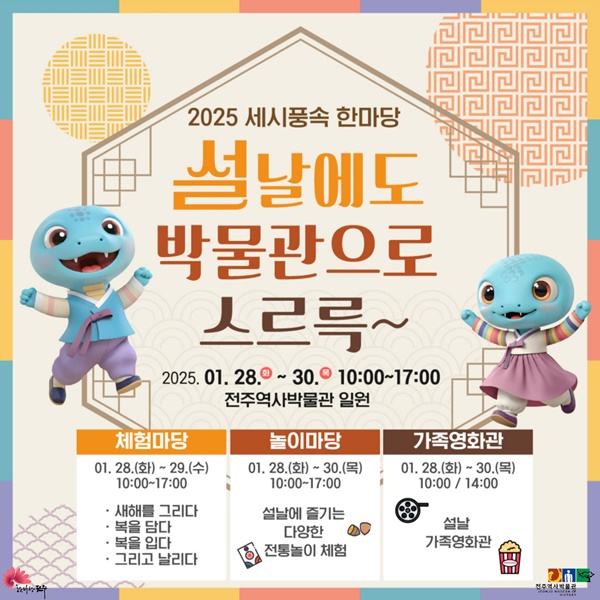 먼저 전주역사박물관은 ‘설날에도 박물관으로 스르륵~’을 주제로 가족 단위 관람객들이 함께 즐길 수 있는 다양한 체험 프로그램을 마련했다.