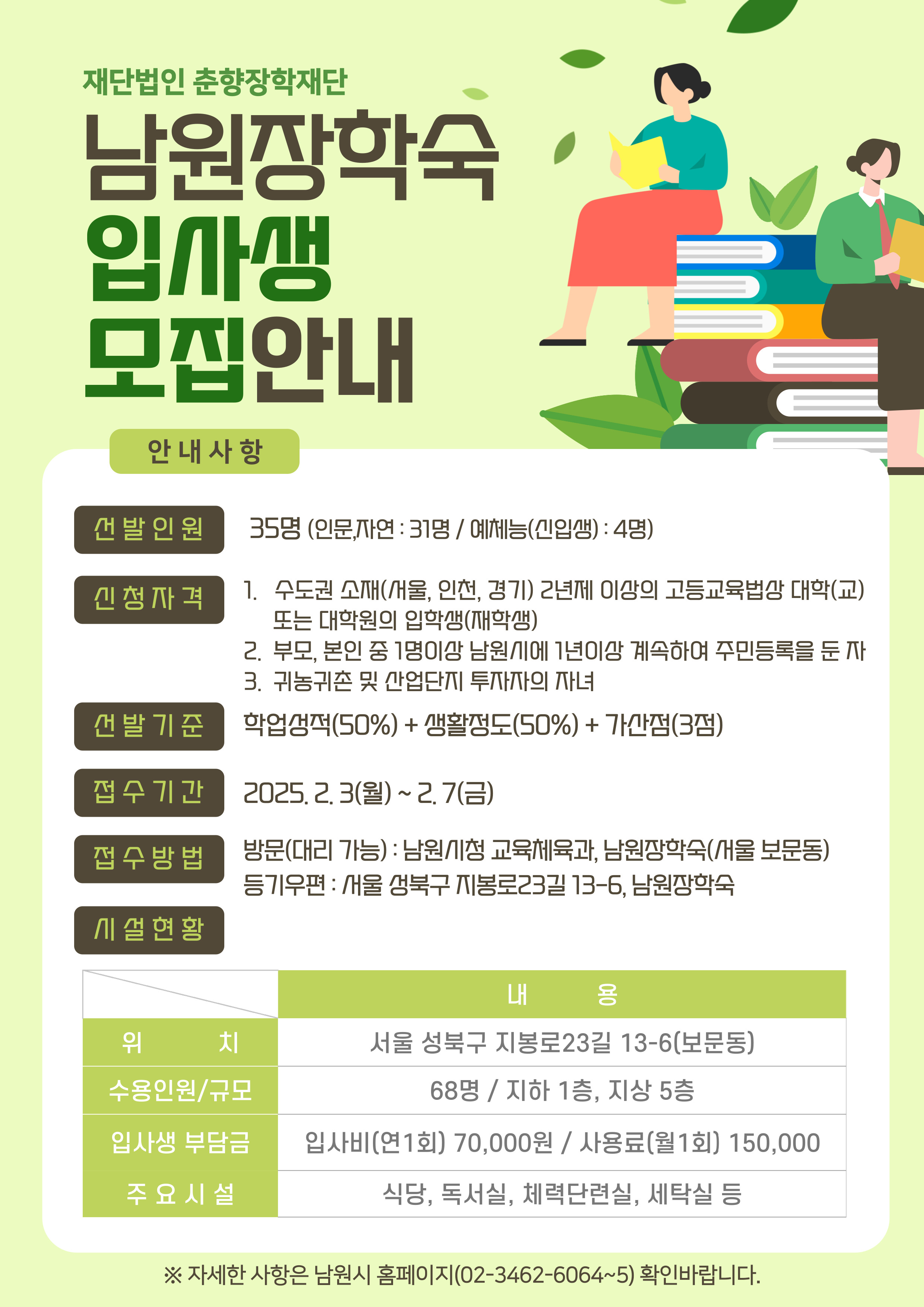 신청 기간은 2025년 2월 3일부터 2월 7일까지이며, 남원시청 교육체육과나 남원장학숙(02-3462-6064~5)으로 방문하여 접수하거나 등기우편으로 신청할 수 있다. 자세한 사항은 남원시청 홈페이지 공지사항(https://www.namwon.go.kr/)에서 확인할 수 있다.