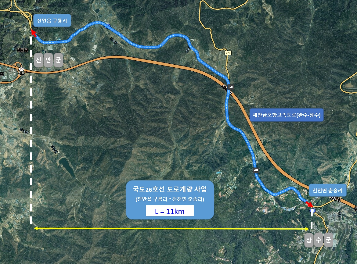 국도26호선 장수 천천~진안 진안간 도로개량사업은 현재 급커브와 급경사 등 선형불량 구간이 많아 안전성이 크게 떨어지는 2차선 도로다. 주민 및 방문객들의 안전을 위해 시급히 진행되어야 할 사업으로 총사업비 817억원을 들여 11.0㎞ 구간의 도로를 개량할 예정이다.
