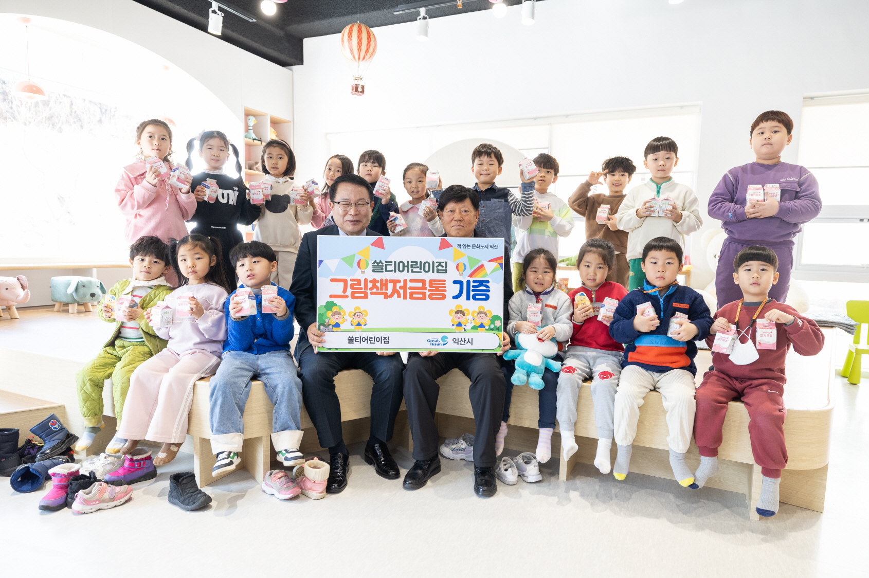 이날 정헌율 익산시장을 비롯해 쏠티어린집 조평대 원장과 원생 20명이 참석한 가운데 개관을 앞두고 있는 수도산 그림책숲도서관에서 저금통 기증식이 진행됐다.