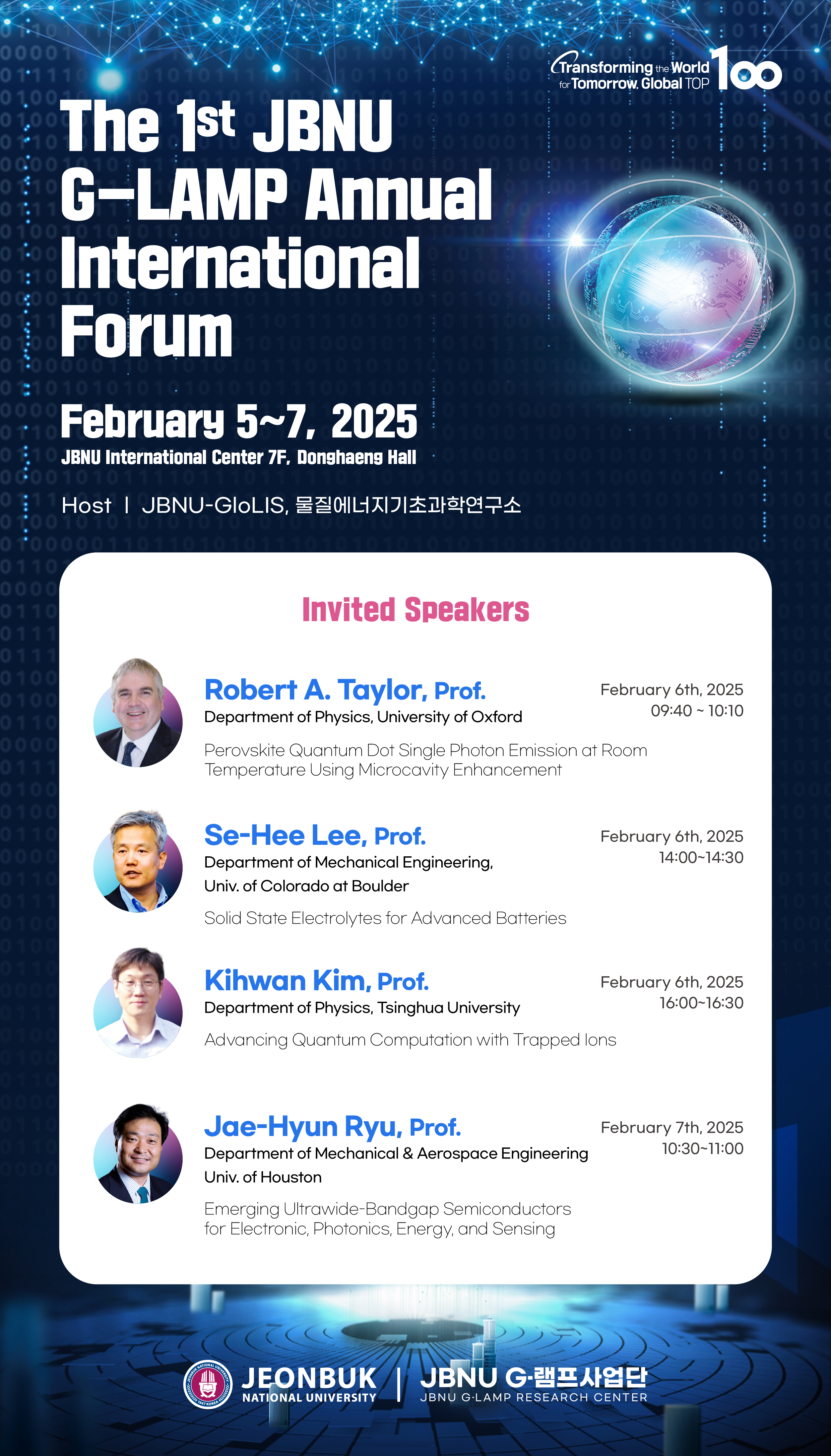G-램프 중점테마연구소인 물질에너지기초과학연구소를 구축하고 있는 전북대는 이번 국제포럼을 통해 국내외 유수 연구자들에게 교류 기회를 제공하고 물질·에너지 분야를 선도할 국제 공동 연구 확대를 위한 발판을 제공하고자 한다. 전북대 G-램프 사업단은 이러한 국제포럼을 매년 정례화해 지속 가능한 기초과학 분야 연구 경쟁력 강화로 이어갈 계획이다.