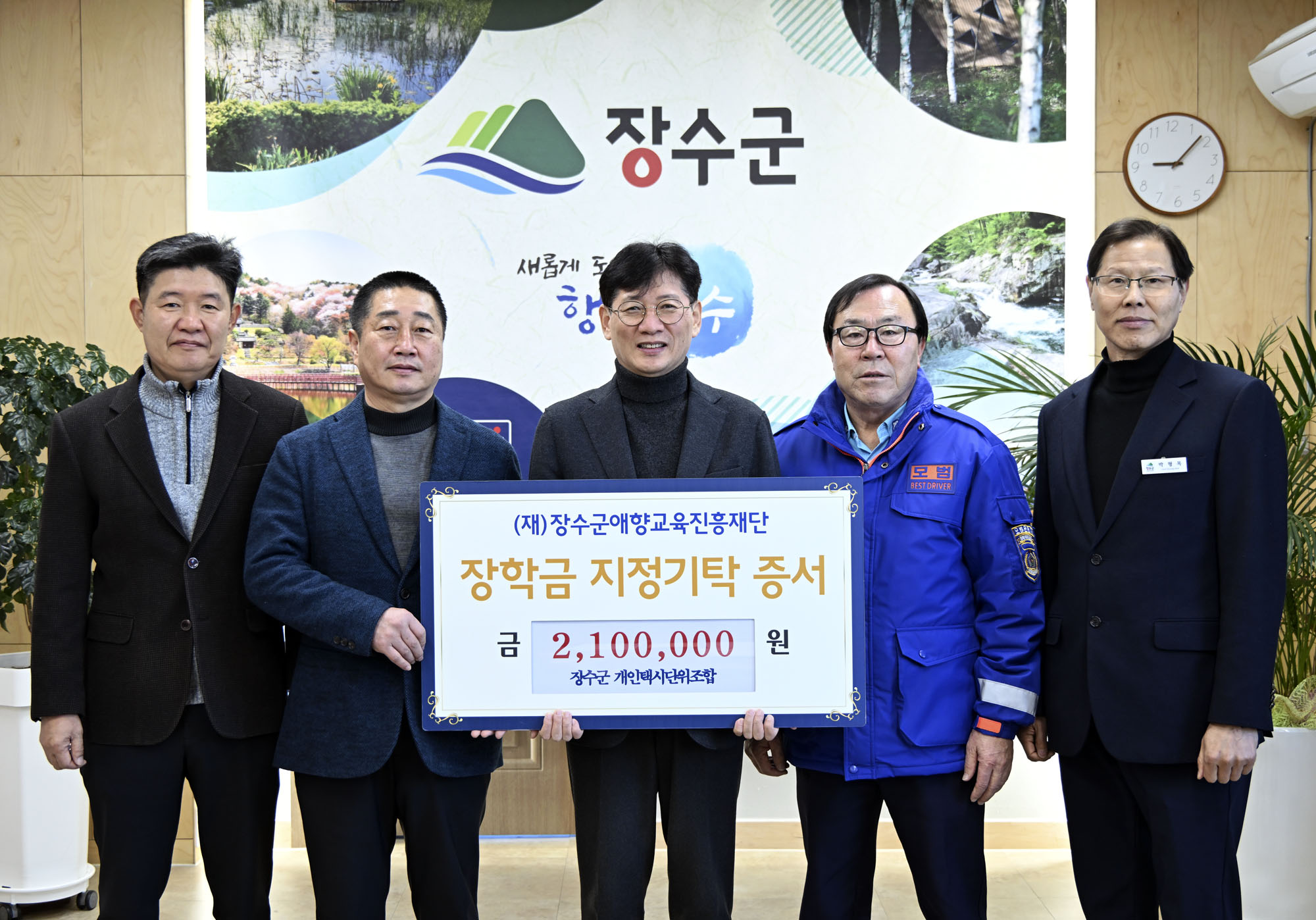 [장수=뉴전북]장수군 개인택시 단위조합(조합장 정춘원)이 5일 장수군청을 방문해 210만원의 장학금을 (재)장수군애향교육진흥재단(이사장 최훈식)에 기탁했다.