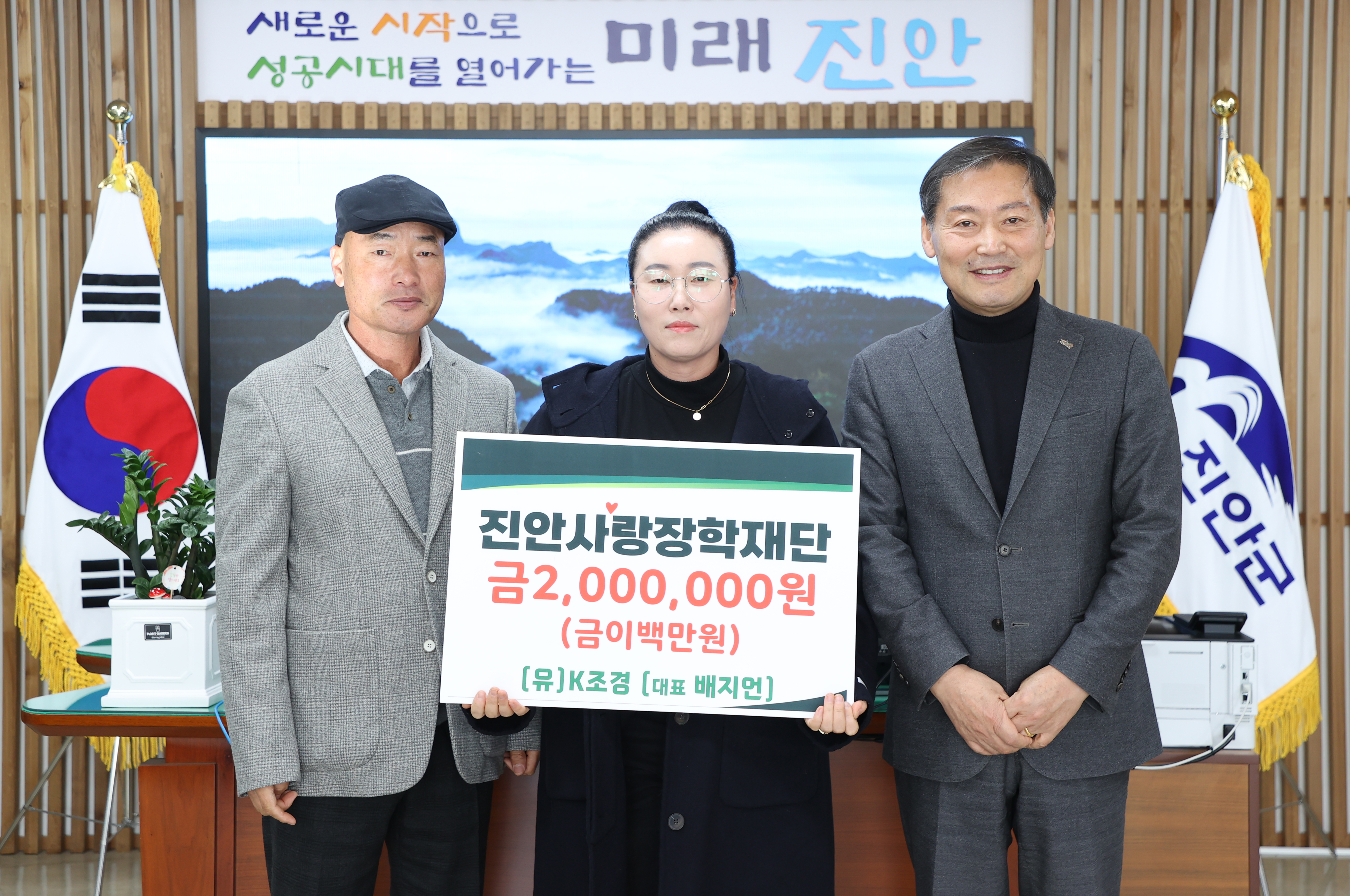 [진안=뉴전북](유)K조경(대표 배지언)은 진안의 미래를 밝히는 데 힘을 보태고자 진안사랑장학재단(이사장 전춘성)에 장학금 200만원을 전달했다.
