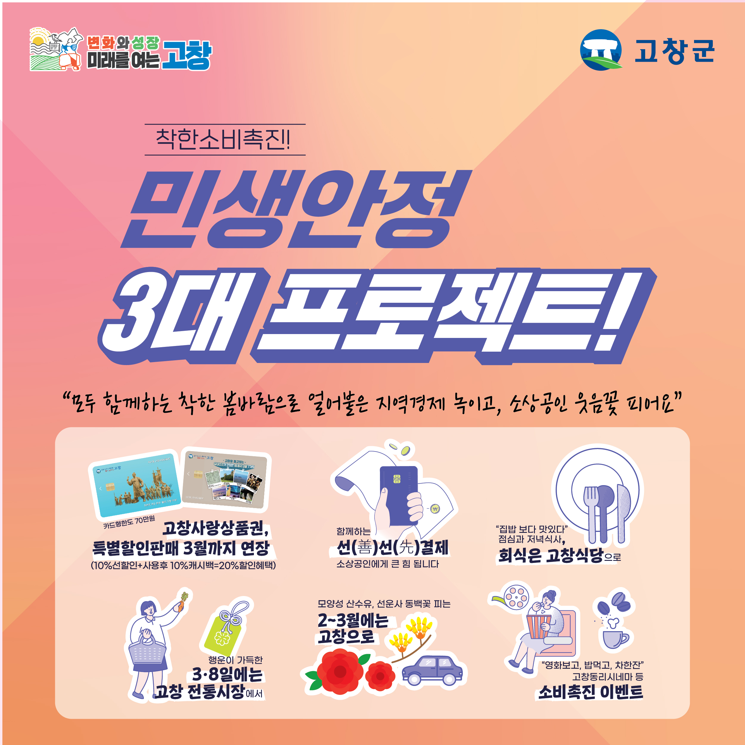 앞서 고창군에서는 고창사랑상품권 10% 선할인과 10% 캐시백 지급 등 총 20% 할인혜택을 주는 특별할인판매를 3월까지 연장했다. 또 고창동리시네마 소비촉진 관람료 할인 이벤트, 고향사랑기부제 답례품 10%를 3월말까지 한시적으로 고창사랑상품권으로 추가 지급하는 등 발빠른 움직임으로 경기부양 대책 마련에 속도를 내고 있다.