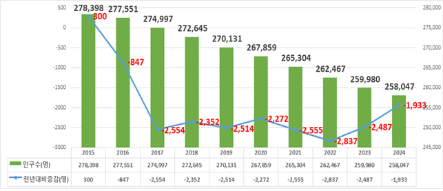 [군산=뉴전북] 군산시 인구감소 추세가 2024년 12월 기준, 주민등록 인구는 지난 1년간 1,933명이 감소한 258,047명으로 집계되었다. 이번 결과는 군산시의 2024년도 인구 현황을 통해 분석됐다.