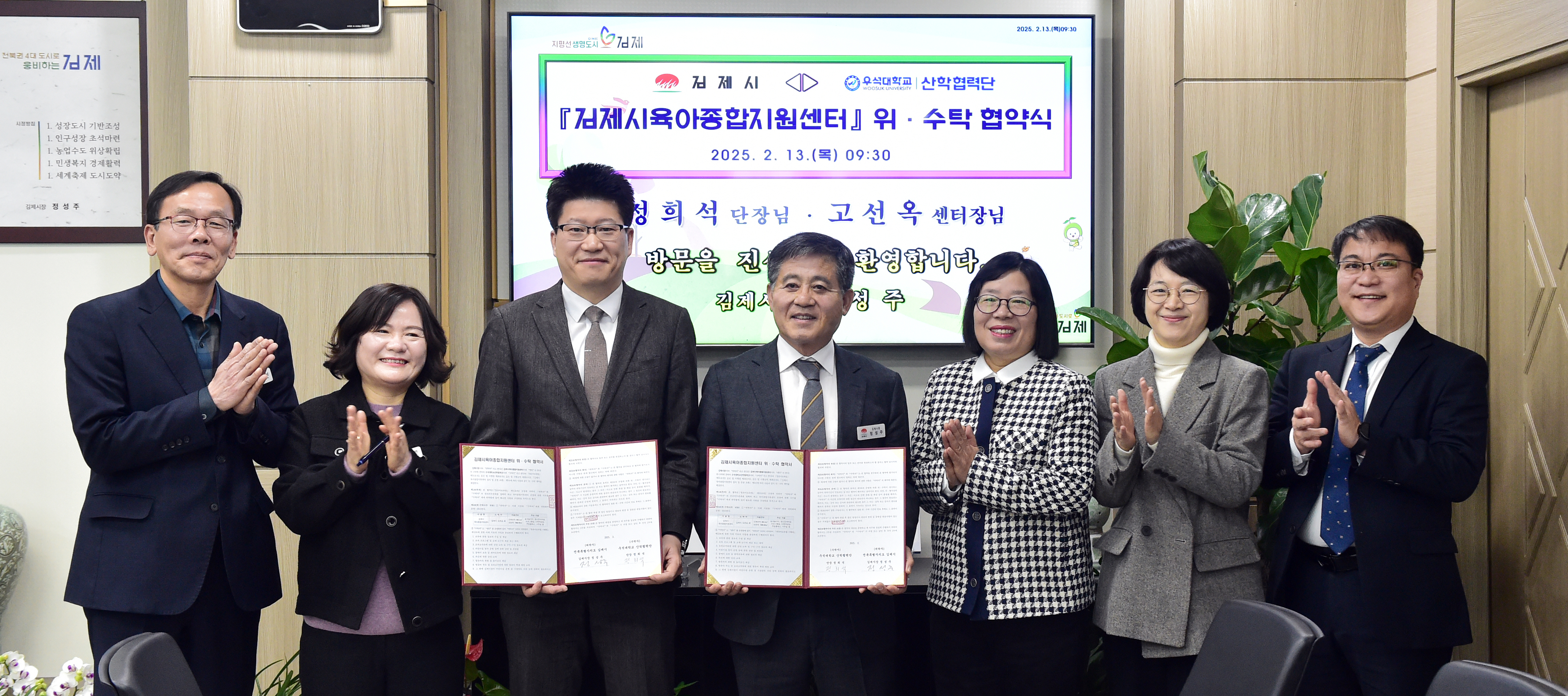 [김제=뉴전북] 김제시(시장 정성주)는 13일 김제시 육아종합지원센터 수탁기관으로 선정된 우석대 산학협력단(단장 정희석)과 위·수탁 업무 협약을 체결했다고 밝혔다.