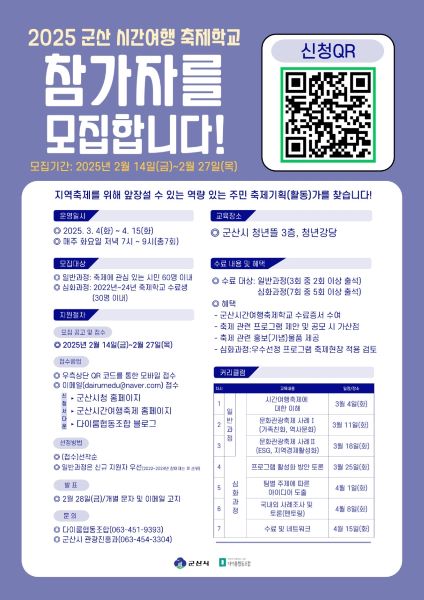 일반과정은 축제에 관심 있는 시민은 누구나 신청이 가능하지만, 심화과정은 기존 2022년~2024년 축제학교 수료생을 대상으로 신청을 받는다. 교육을 마치면 과정별 수료증을 제공하고, 군산시간여행축제 시민기획 프로그램 공모에 지원할 때 가점이 주어진다.
