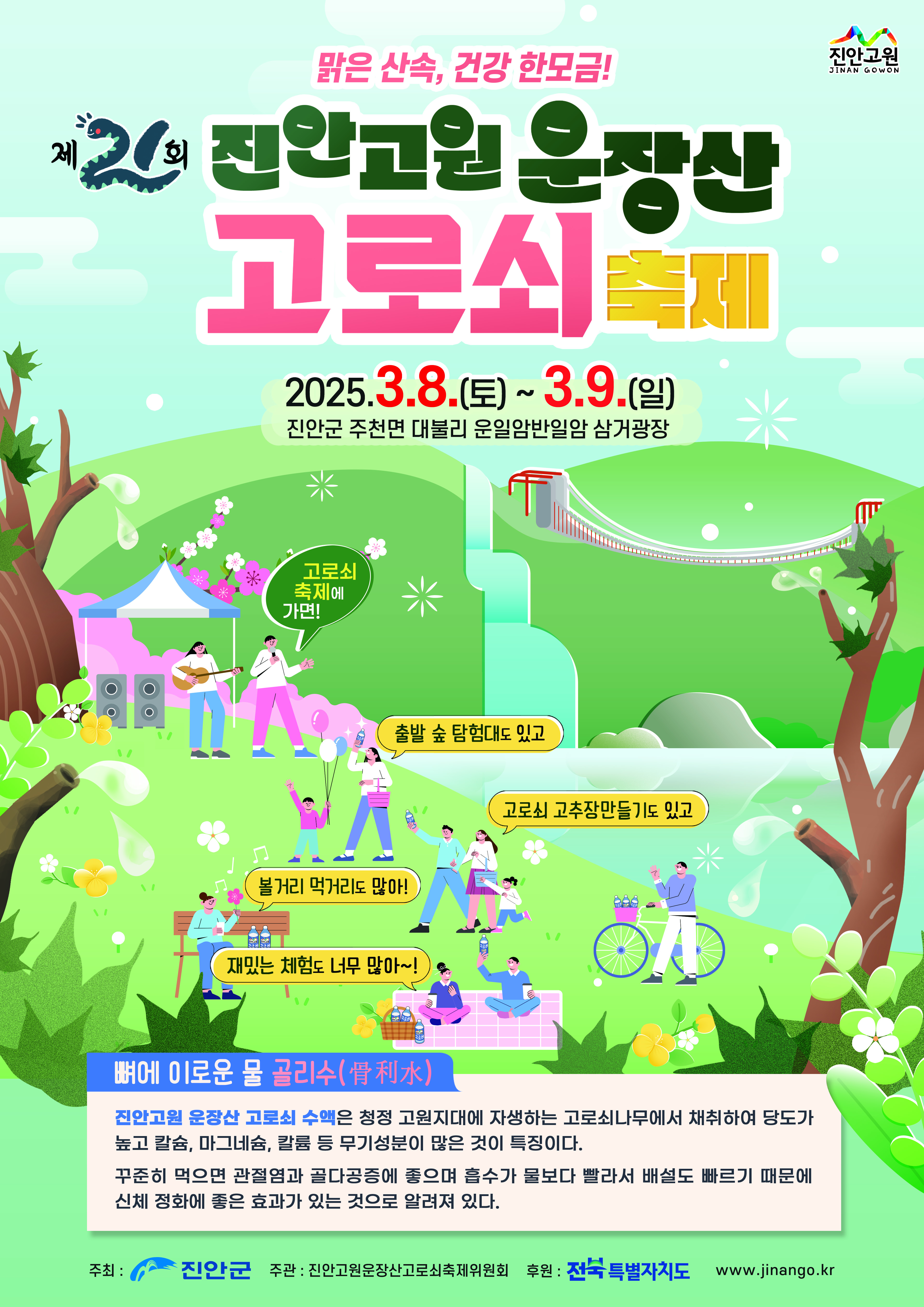 기타 자세한 사항은 진안고원 운장산 고로쇠 축제 홈페이지 https://www.jinango.kr를 확인하면 된다.