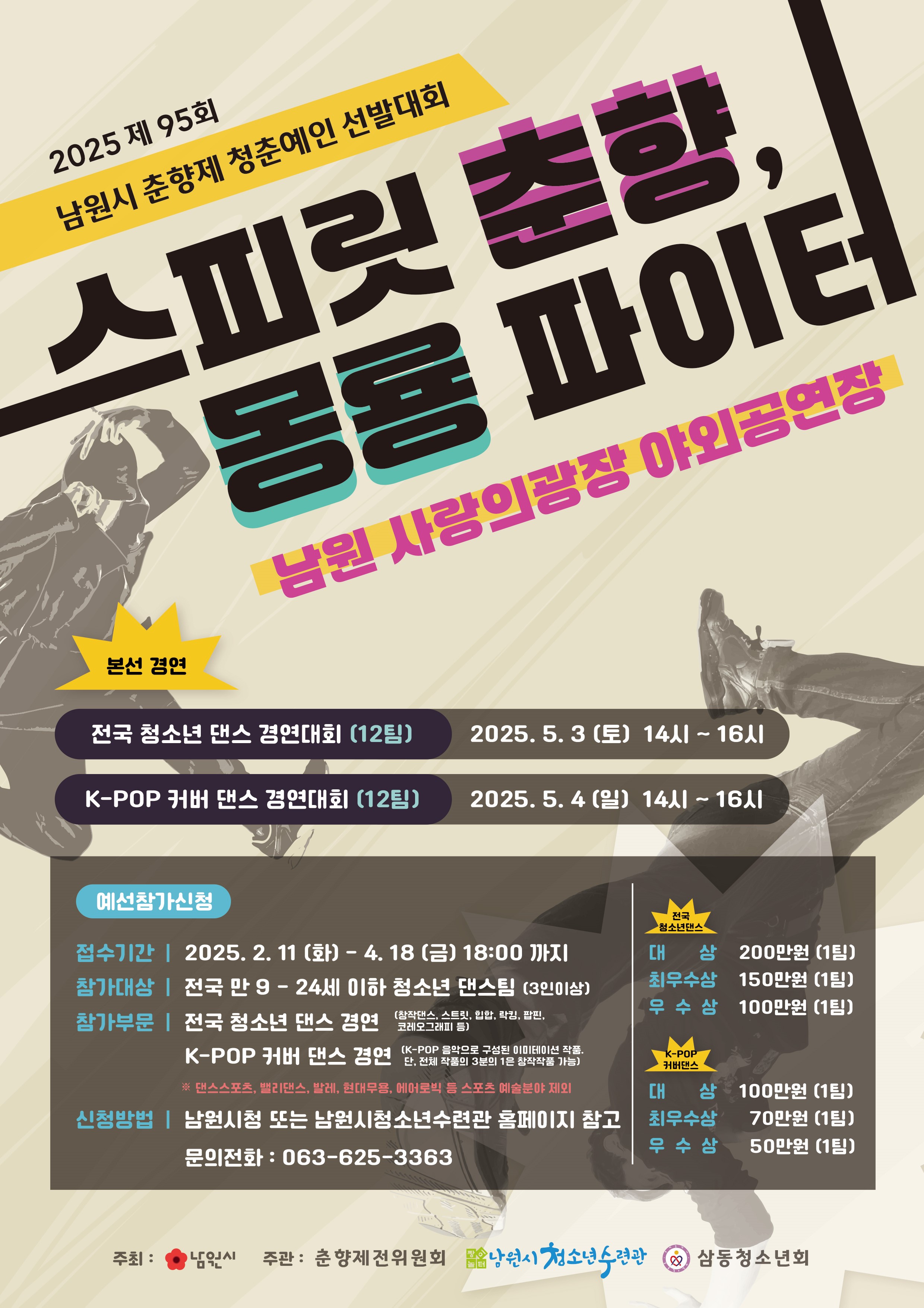 [남원=뉴전북] 남원시는 제95회 춘향제(2025.4.30.~5.6.)을 맞아 청소년들의 끼와 역량을 발휘할 수 있는 댄스 경연대회 '스피릿 춘향, 몽룡 파이터'를 5월 3일과 4일 양일간 남원 사랑의 광장 야외공연장에서 개최한다고 밝혔다.