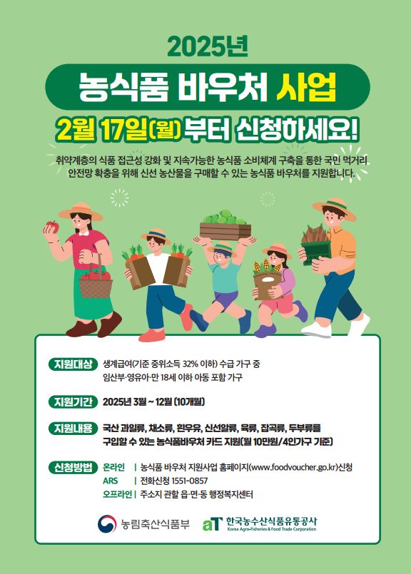 신청은 농식품 바우처 누리집(www.foodvoucher.go.kr) 또는 전화(1551-0857)로 하거나 주민등록주소지 관할 읍·면사무소를 방문해 접수할 수 있다.