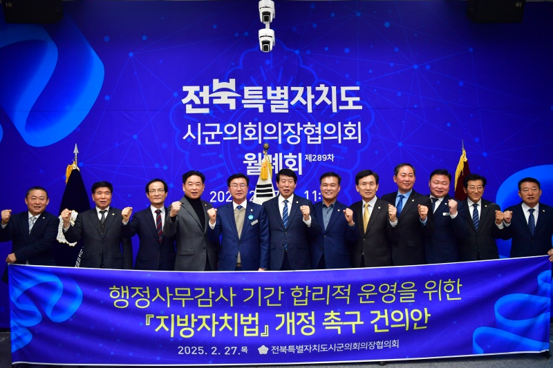[정치=뉴전북] 완주군의회(의장 유의식)는 27일 열린 제289차 전북특별자치도 시·군의회 의장협의회 월례회에서 ‘행정사무감사 기간 합리적 운영을 위한 ’지방자치법 개정 촉구 건의안’을 제출했으며, 해당 건의안이 만장일치로 채택됐다고 밝혔다.