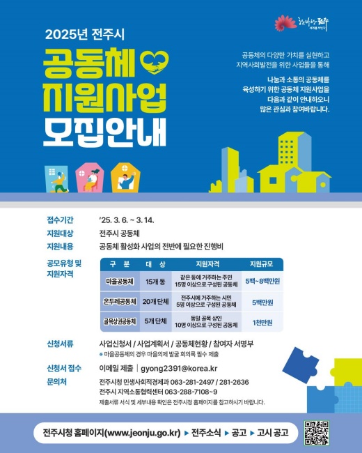 [전주=뉴전북] 전주시는 오는 6일부터 14일까지 나눔과 소통의 가치를 실현하고, 지역 공동체를 더욱 활성화하기 위한 ‘2025 전주시 공동체 지원사업’에 참여할 공동체를 공개 모집한다.