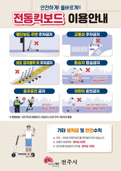 최준범 전주시 대중교통국장은 “횡단보도와 교통섬 등 보행에 방해가 되는 장소에 주차하지 않도록 협조 부탁드린다”면서 “올바른 이용 문화를 확산하기 위해 전동킥보드 이용 안내 전단지를 제작 및 배포할 예정”이라고 말했다.