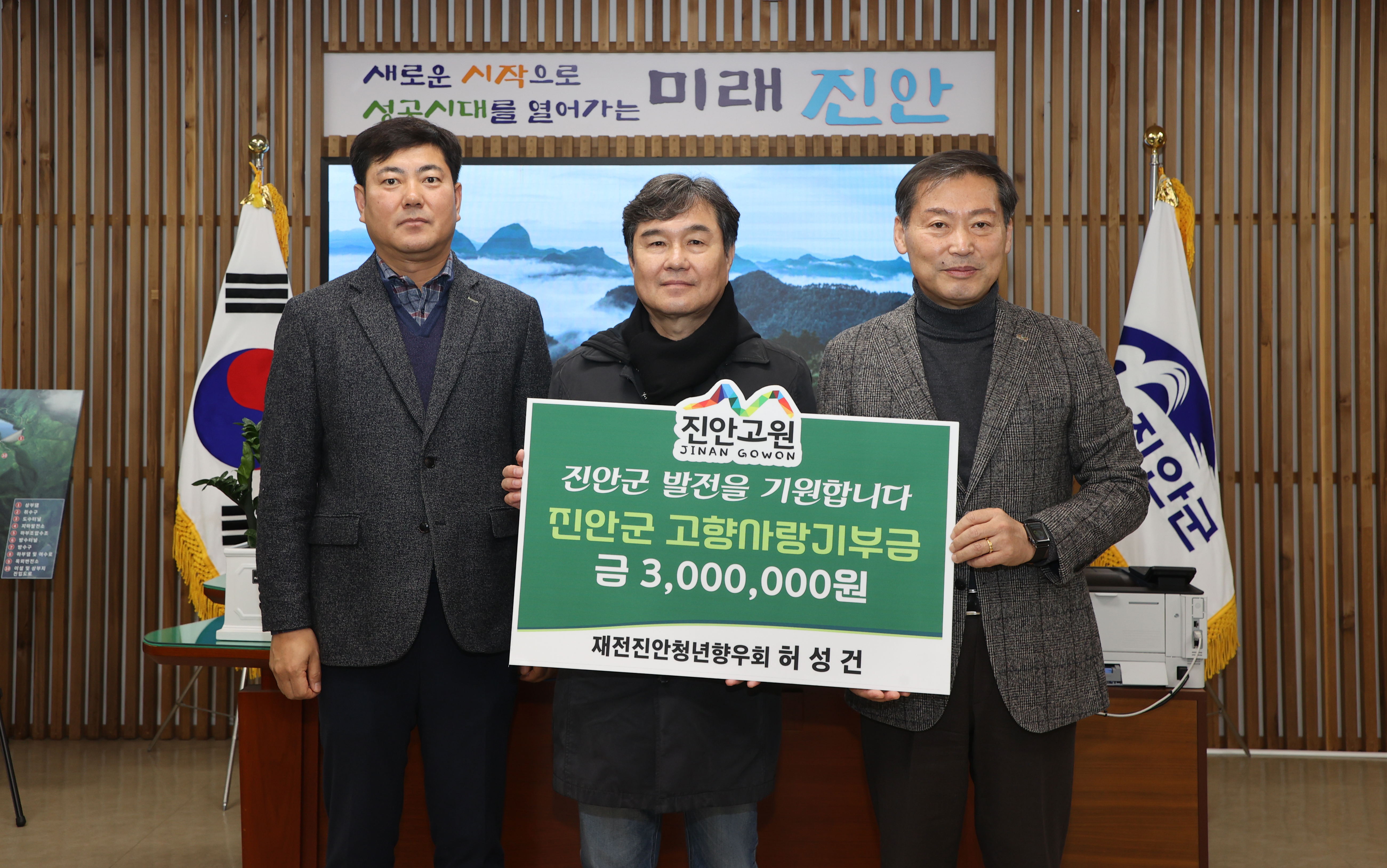 5일 재전진안청년향우회는 진안군수실을 방문해 고향사랑기부금 3백만원을 전달했다. 재전진안청년향우회는 재전진안향우회 안에 소속된 향우회 모임이다.
