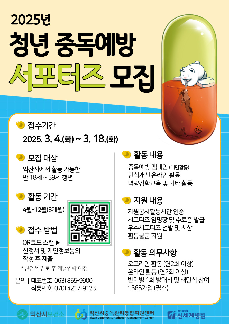 익산시중독관리통합지원센터(센터장 이현기)는 만 18~39세 청년을 대상으로 오는 18일까지 '청년 중독 예방 서포터즈 3기'를 모집한다고 11일 밝혔다.
