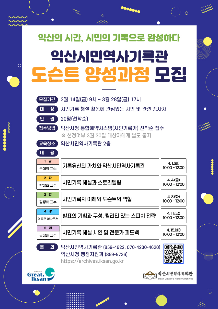 익산시는 '시민기록 도슨트 양성과정' 교육생을 오는 14일부터 28일까지 모집한다고 13일 밝혔다. 선착순 20명을 모집하며, 신청은 익산시 누리집 통합예약 시스템을 통해 하면 된다.