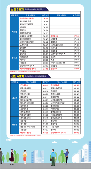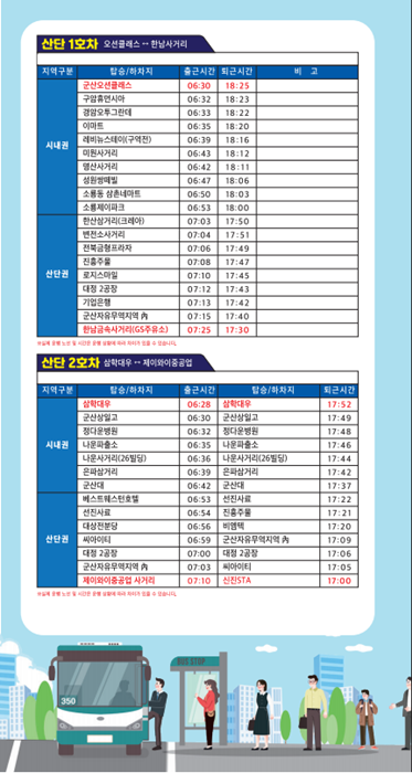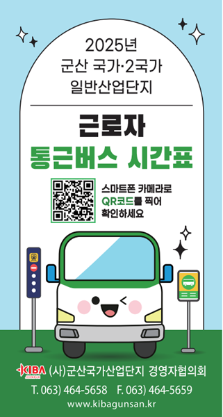 출·퇴근버스와 관련한 세부 노선과 운행 시간은 군산시청 누리집 ‘기업지원 정책란’과 군산 국가 산업단지 경영자협의회 누리집에서 확인할 수 있다.