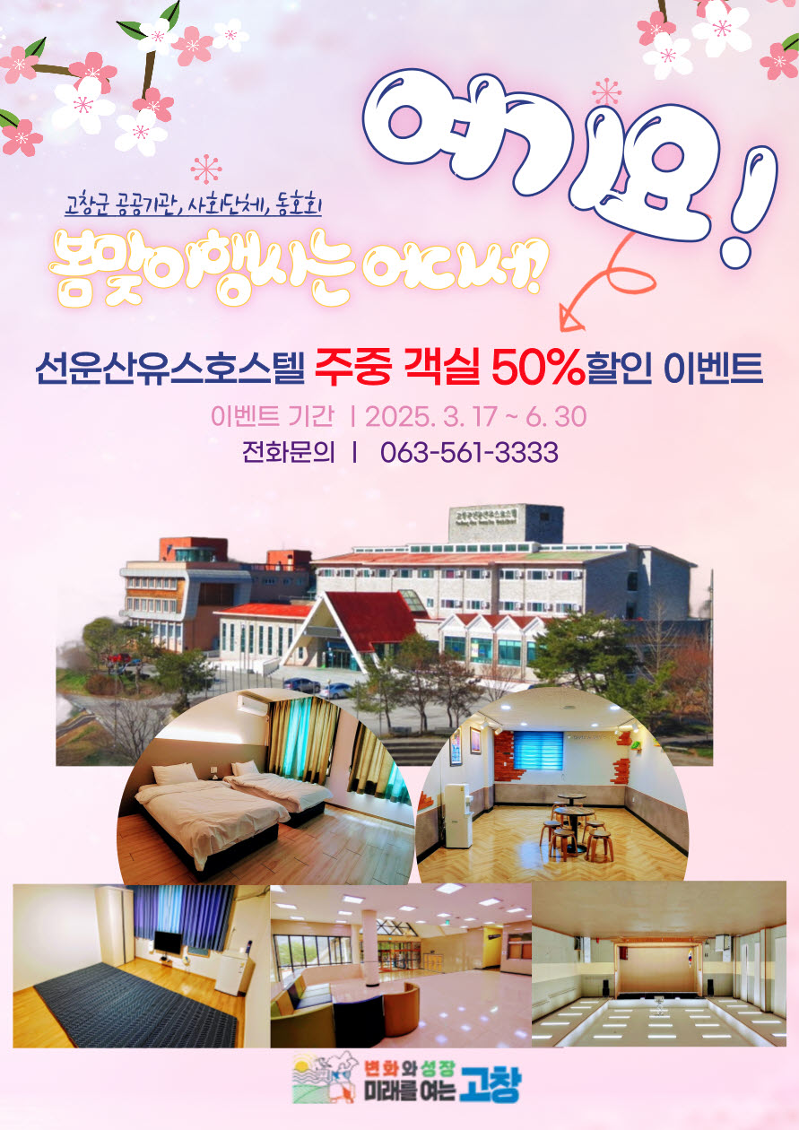 [고창=뉴전북] 고창군 선운산유스호스텔이 6월30일까지 주중(일요일~목요일, 공휴일 전일 제외) 객실 이용료 반값 할인 행사를 진행한다고 25일 밝혔다.