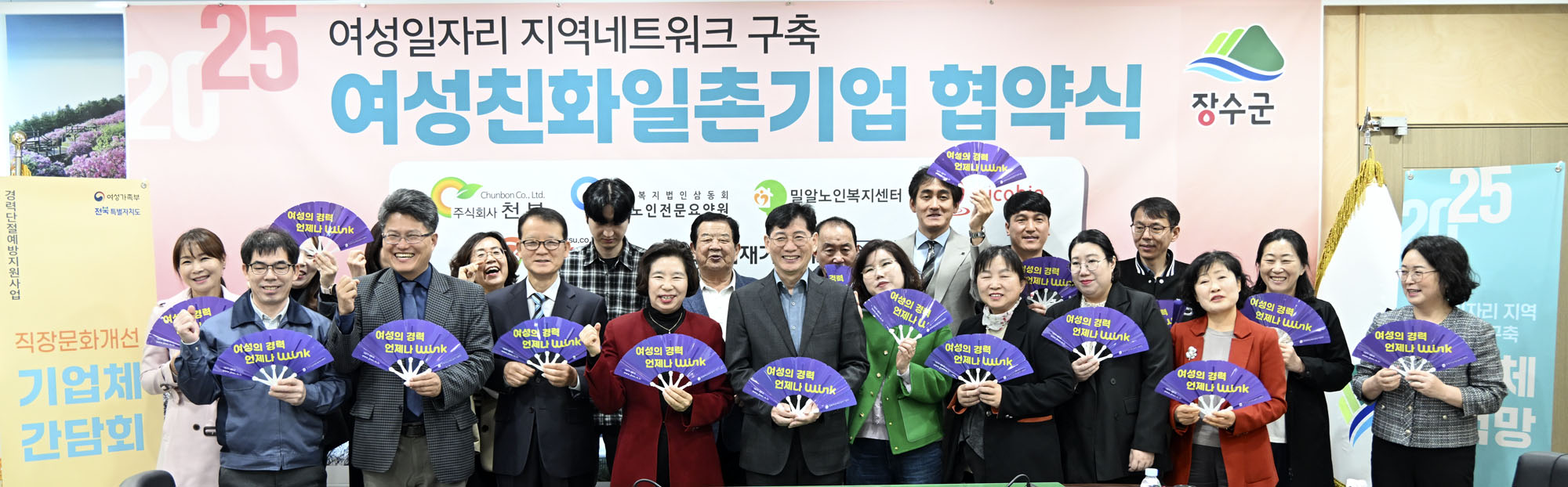 [장수=뉴전북]장수군이 전북광역여성새로일하기센터(원장 전정희)와 함께 지역 여성들의 일자리 창출을 위해 25일 장수군청 2층 회의실에서 지역 내 7개 기업과 ‘여성친화 일촌기업’ 업무협약을 체결했다.
