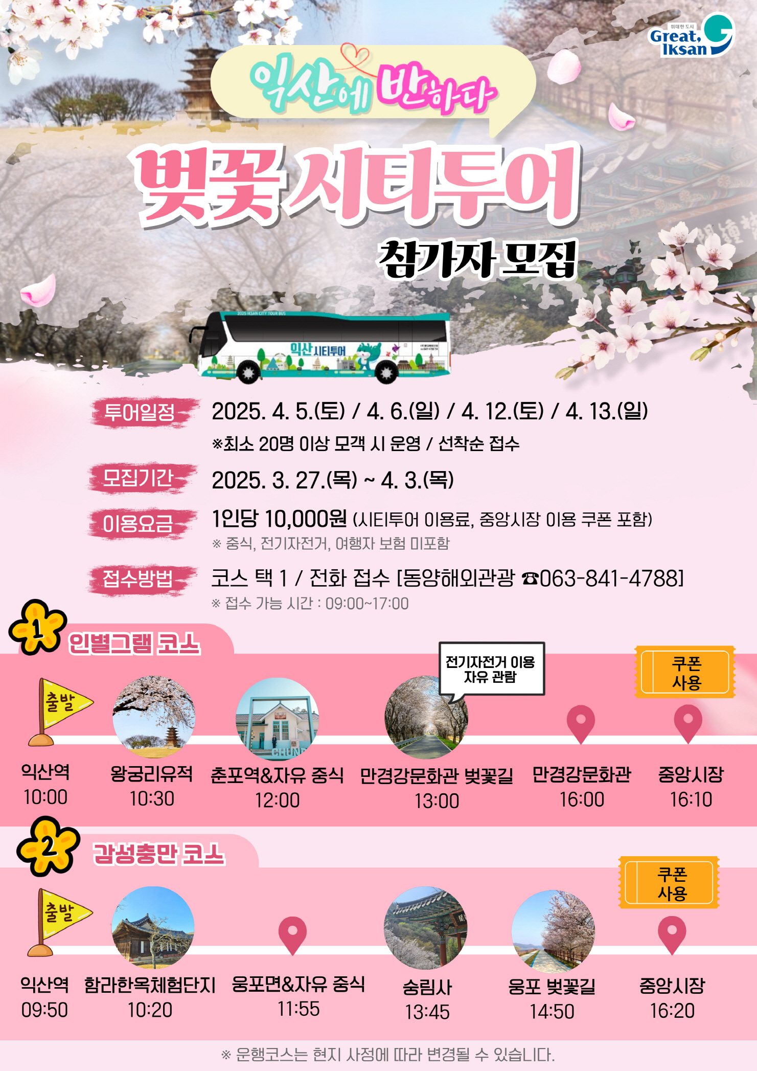 이번 시티투어는 익산의 아름다운 벚꽃 명소와 전통시장을 연계해 구성된 특별 노선으로, 봄 정취와 지역 상권을 동시에 즐길 수 있다.