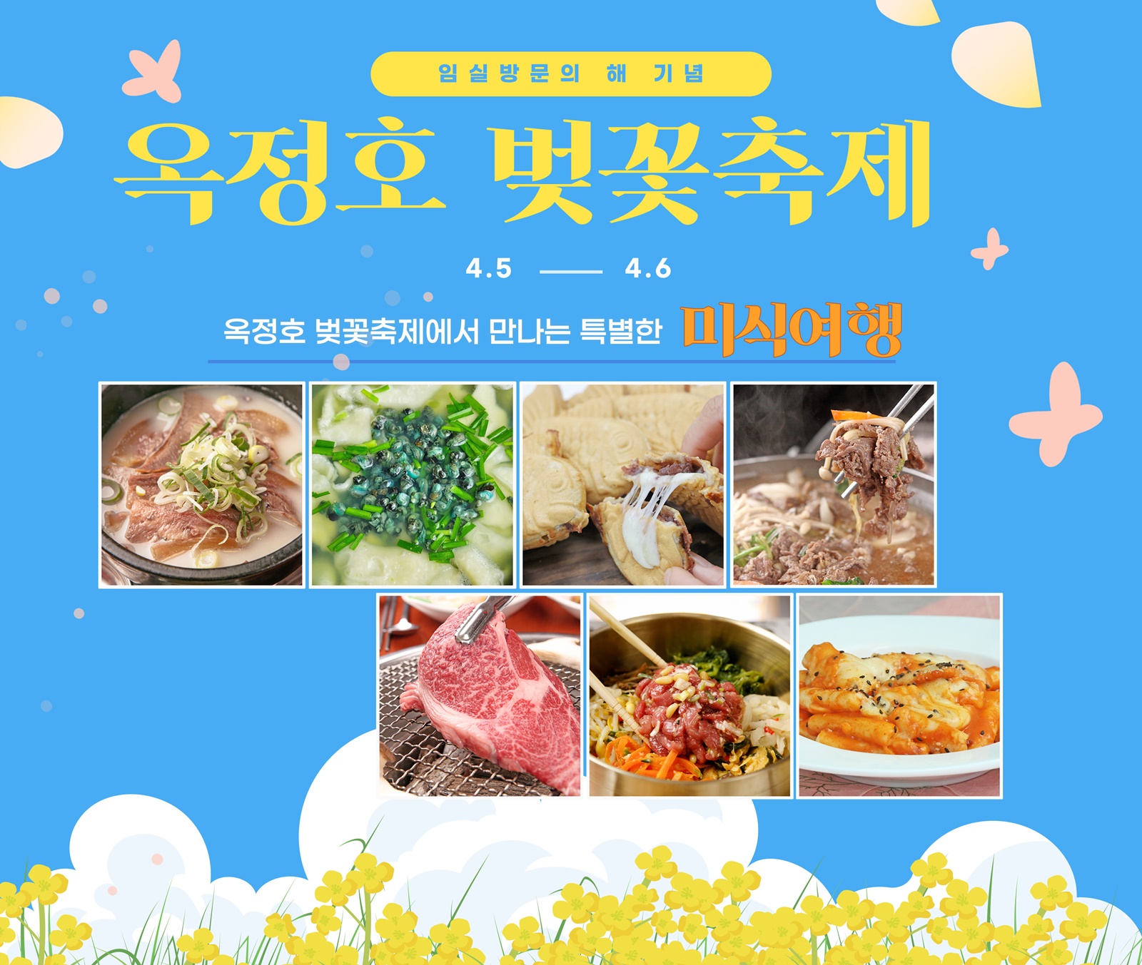 - 벚꽃 만개하는 4월 5일과 6일 2일간, 옥정호 출렁다리 광장․붕어섬 생태공원에서,한우‧소머리국밥‧치즈붕어빵 등 먹거리 가득, 주차‧교통 편의 대폭 확대