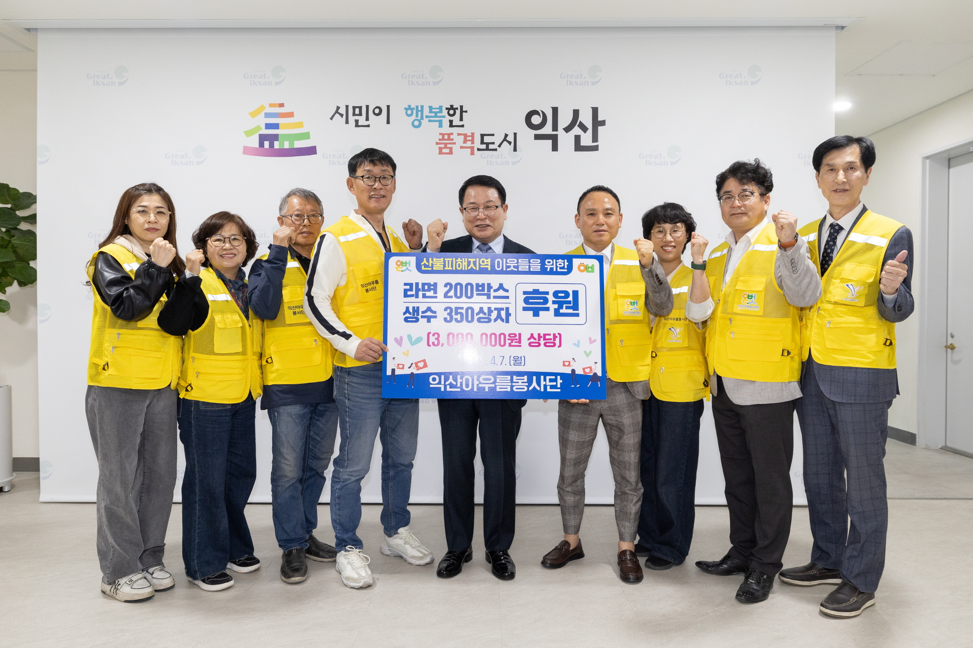 익산시는 익산아우름봉사단이 시청을 방문해 산불 피해 지역 이재민을 위한 생수 300상자, 라면 200상자 등 총 300만 원 상당의 물품을 기탁했다고 7일 밝혔다.