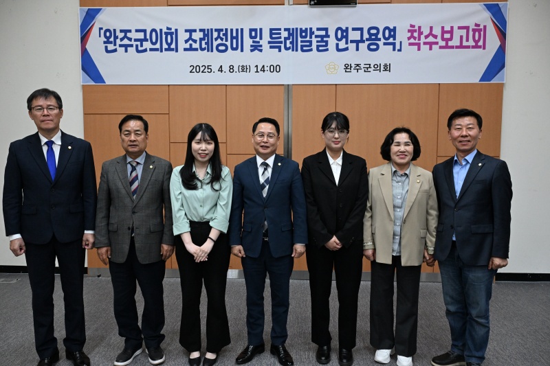 [정치=뉴전북] 완주군의회 조례정비 및 특례발굴 연구회(대표 성중기 의원)는 8일 군의회 문화강좌실에서 ‘조례정비 및 특례 발굴 연구용역’ 착수보고회를 개최하고, 본격적인 과업 추진에 돌입했다.